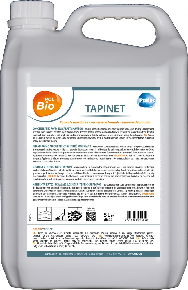 Polbio Tapinet, 5L, probiotikus hatásmechanizmusú habzó kárpittisztítószer kézi és egytárcsás tisztításra.